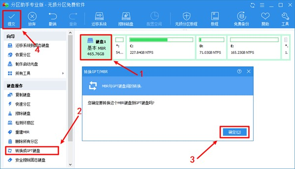 注意:数据无价,操作前请先备份数据,免费备份工具:点击下载1、下载安装傲梅分区助手:点击下载2、选中你要转换的硬盘,注意是选择硬盘,而不是分区;3、选择左边操作栏的“转换成GPT硬盘”(如果你的硬盘格式本来就是GPT则会显示“转换成MBR硬盘”,然后点击确定。);4、最后点左上角提交执行。